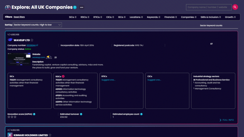 Alongside powerful filters, The Data City includes over 500 ready-made sector classifications called Real-Time Industry Classifications (RTICs), built with government and industry experts using machine learning and website data.