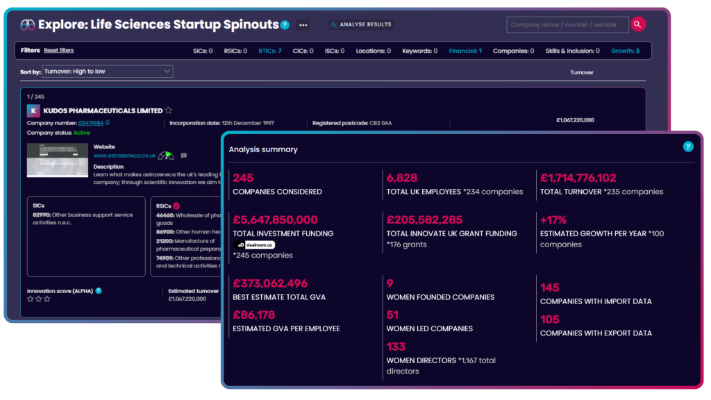 Interested in Life Sciences spinouts in the UK for example? Within a few clicks you can find over 300 companies.