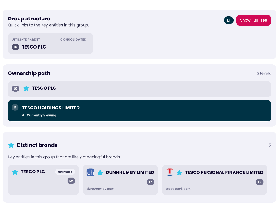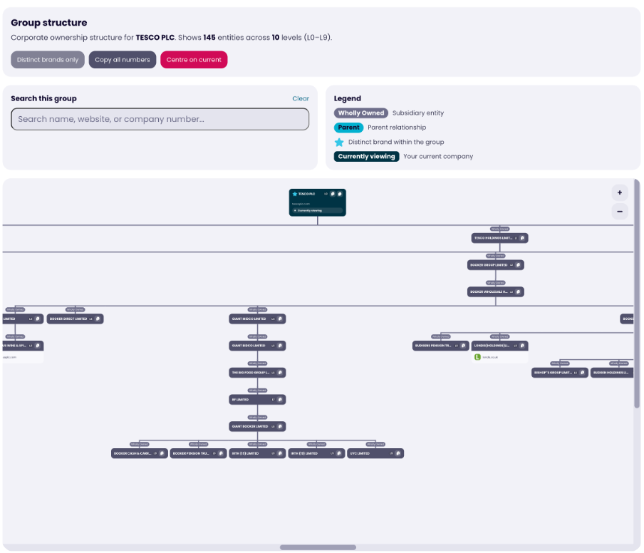 The group structure tree is a helpful way of understanding the layout of the group. Groups can be large, and distinct brands are also presented on the group structure tree. In the case of Tesco PLC, there are 145 entities across 10 levels of group structure.