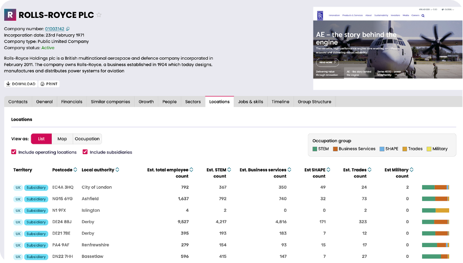 As well as the introduction of the group structure tab on a company page, we’ve also made changes to location information. The chart below shows a list of all of Rolls-Royce’s locations. Where a subsidiary also operates at the location, we also flag the location with this information. This helps prevent double counting of locations and improves our estimates of employees in each region.