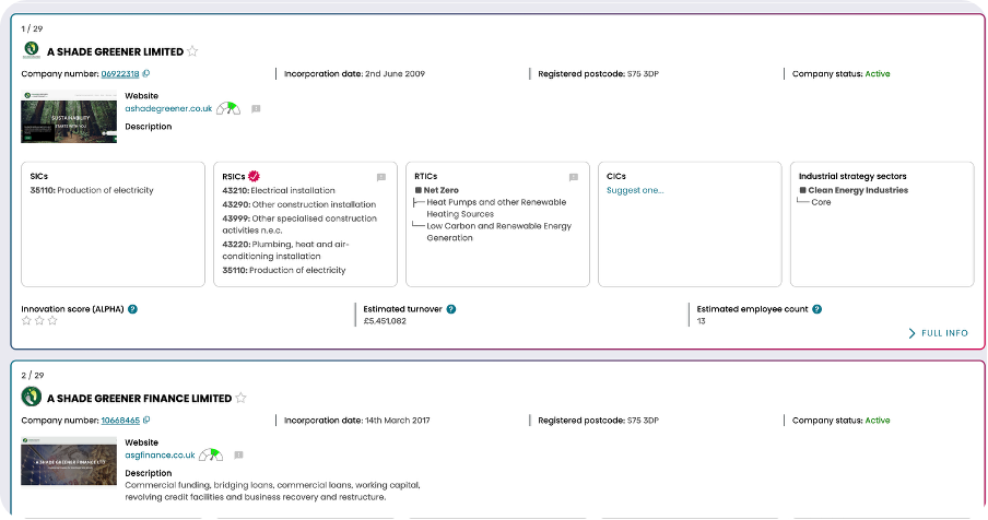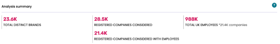 The screenshot above shows the analysis summary for the Net Zero RTIC. We’re saying there are 23,600 unique brands across the list. The 28,500 figure refers to the number of registered companies there are in total, as a brand can have multiple registered companies underneath it, as was shown with the earlier Tesco example. By using the number of distinct brands, we hope to better capture how many unique companies there are that are active in the sector.