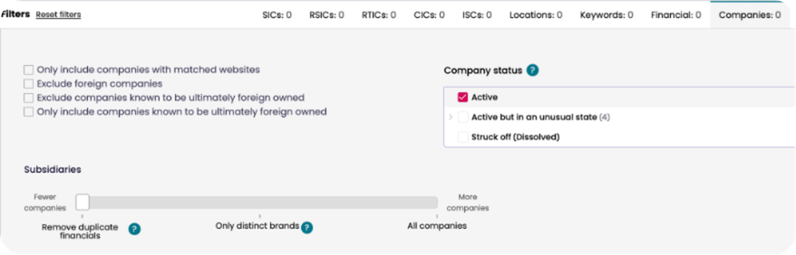 Compared to previous versions of the Industry Engine, you may notice that the overall count of businesses, number of employees and/or the amount of turnover has changed. This is because we are removing duplicate financials by default on analyse. This is the same functionality that you had before with the “remove subsidiary companies” toggle option, with some small improvements to how it functions.