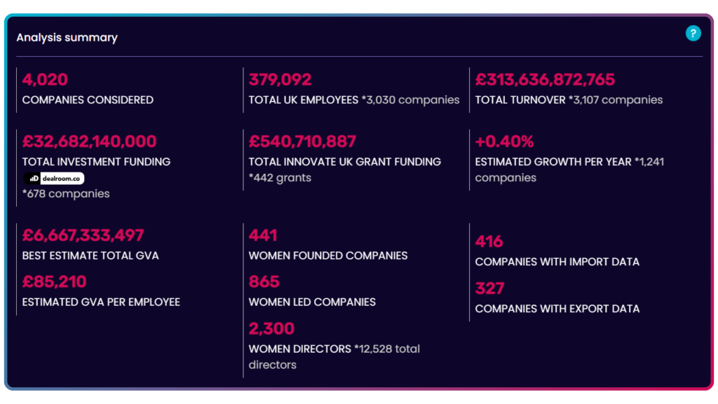With our real-time data and RTICs, we’re able to track the sector as it evolves. If you want to find out more about the growth of AI companies in the UK both at a macro and company-level, and see the biggest players in the market, our platform can help.