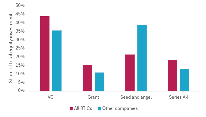 The profile of investment into RTIC companies was skewed toward venture capital and grants. Venture capital accounted for 44% of investment rounds into RTIC companies, compared to 35% for companies elsewhere in the economy. And grants made up 15% of all investment rounds in in cutting-edge companies, compared to 11% for all other companies (see Figure 2).