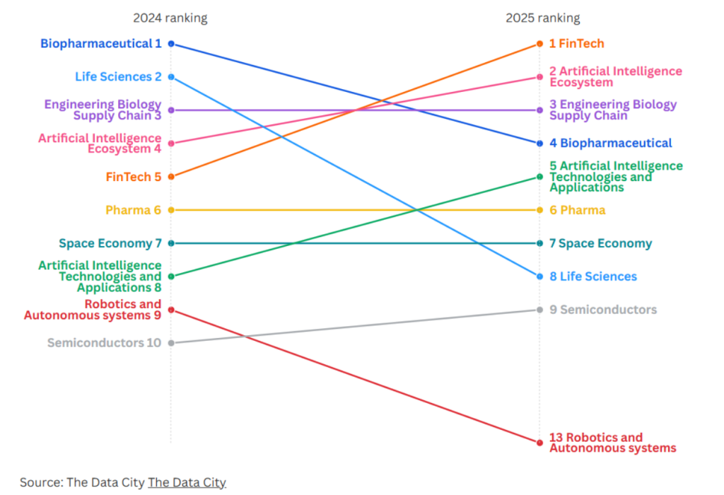 The areas of the cutting edge that performed the strongest were FinTech, Artificial Intelligence Ecosystem and Engineering Biology Supply Chain. As Figure 1 shows below, FinTech was the strongest performer. It accounted for around 3% of all cutting-edge businesses, but 13% of all investment.