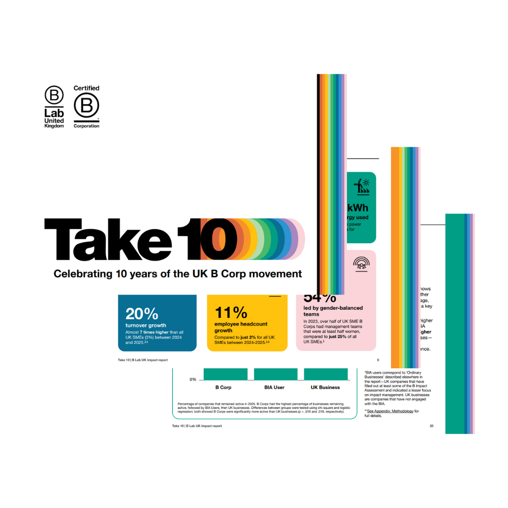 To mark ten years of B Corps in the UK, B Lab UK published its 2025 Impact Report, ‘Take 10’. The report aimed to show that B Corps don’t just behave differently, they perform differently too. It explored the impact of B Corps on people, the planet and the economy, with a clear goal: prove that doing business with purpose delivers results.